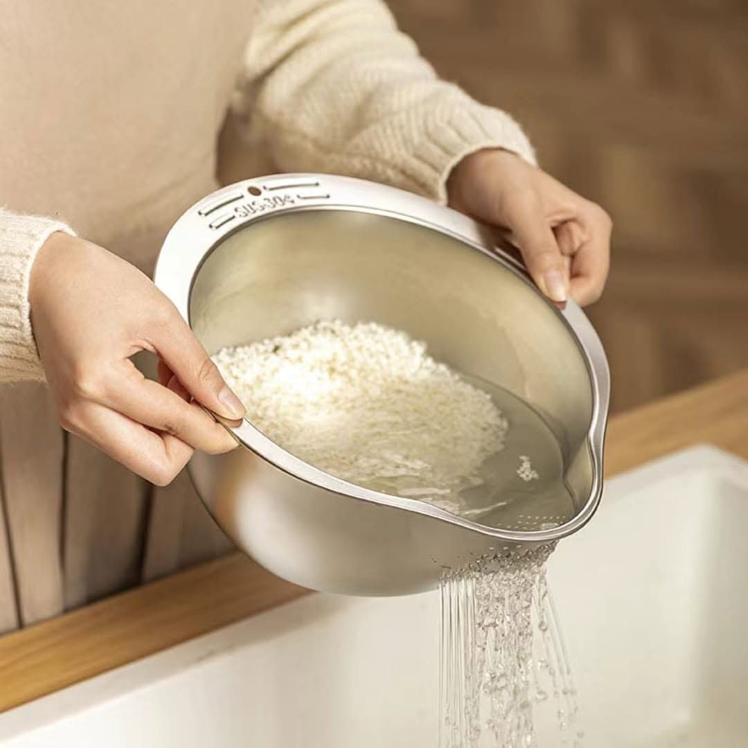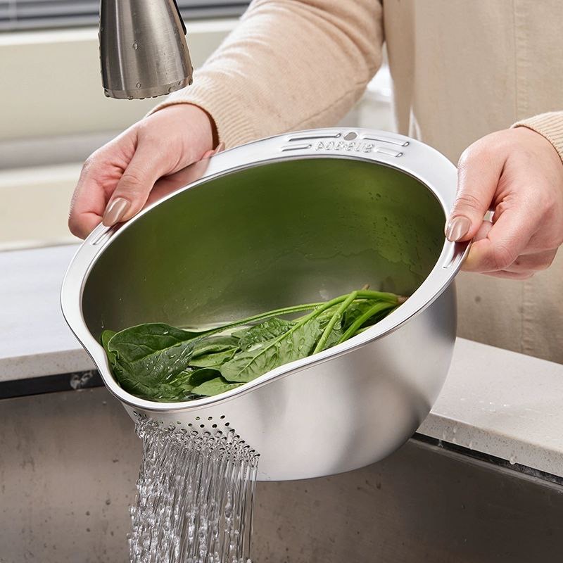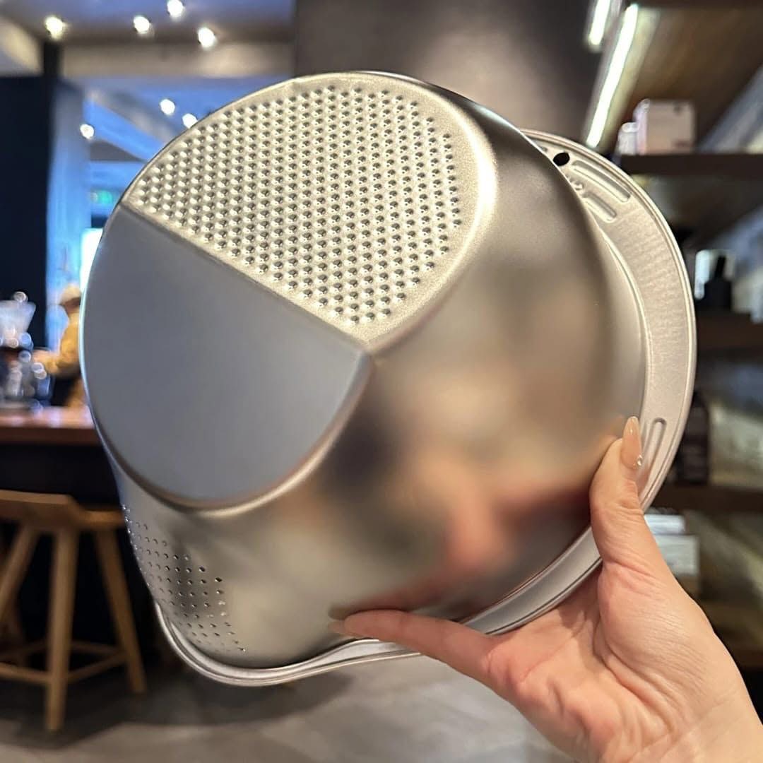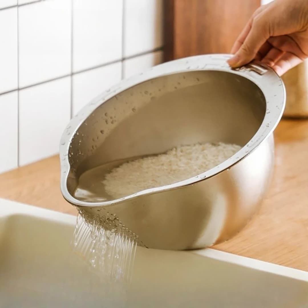 آبکش استیل چند منظوره محصول وارداتی Unique جنس:استیل ضد زنگ 304 مناسب برای آبکشی برنج،ماکارونی،سبزیجات،میوه،صیفیجات و... ارتفاع:11 سانتیمتر ابعاد:24×27 سانتیمتر