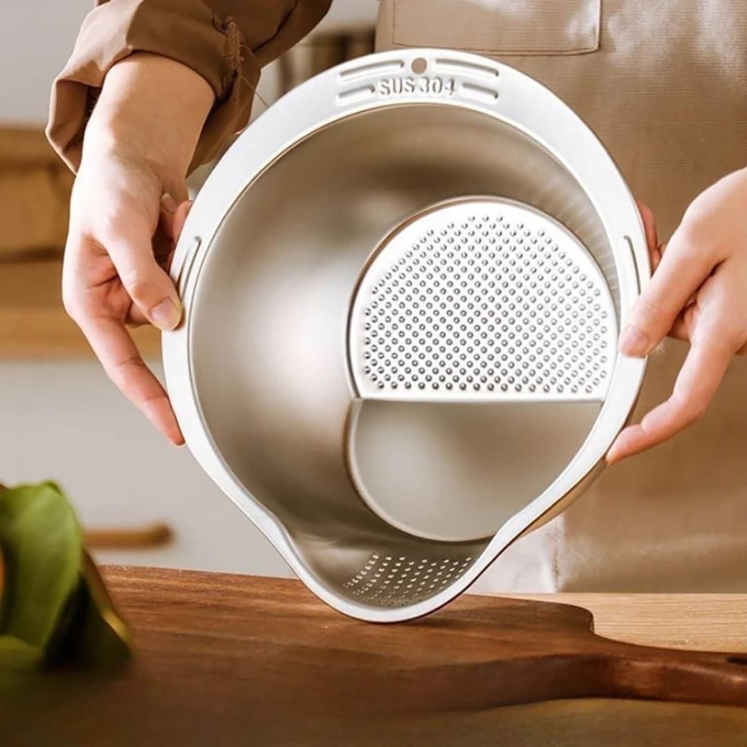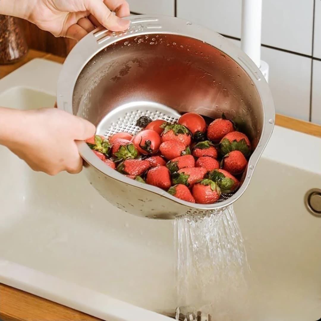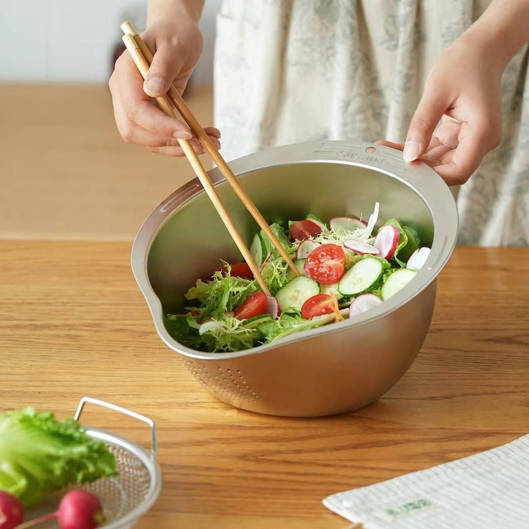 آبکش استیل چند منظوره محصول وارداتی Unique جنس:استیل ضد زنگ 304 مناسب برای آبکشی برنج،ماکارونی،سبزیجات،میوه،صیفیجات و... ارتفاع:11 سانتیمتر ابعاد:24×27 سانتیمتر