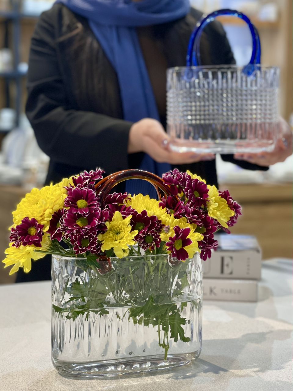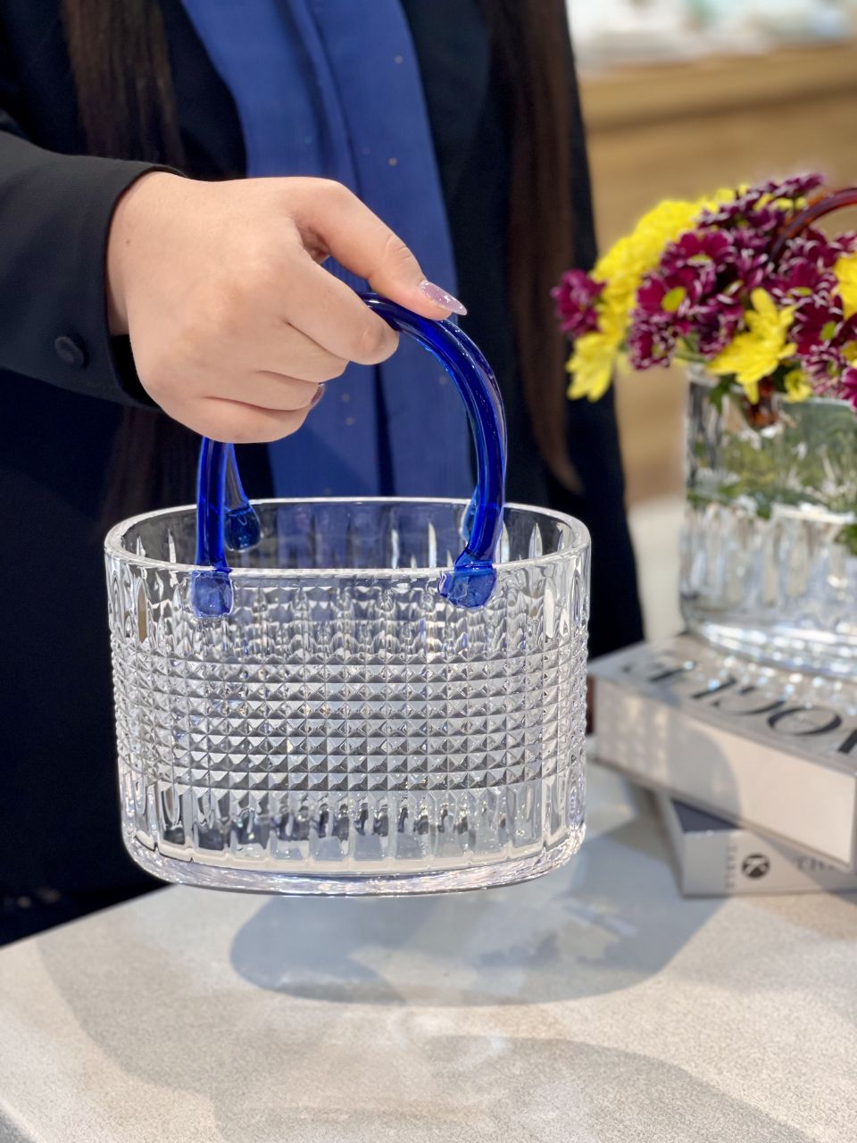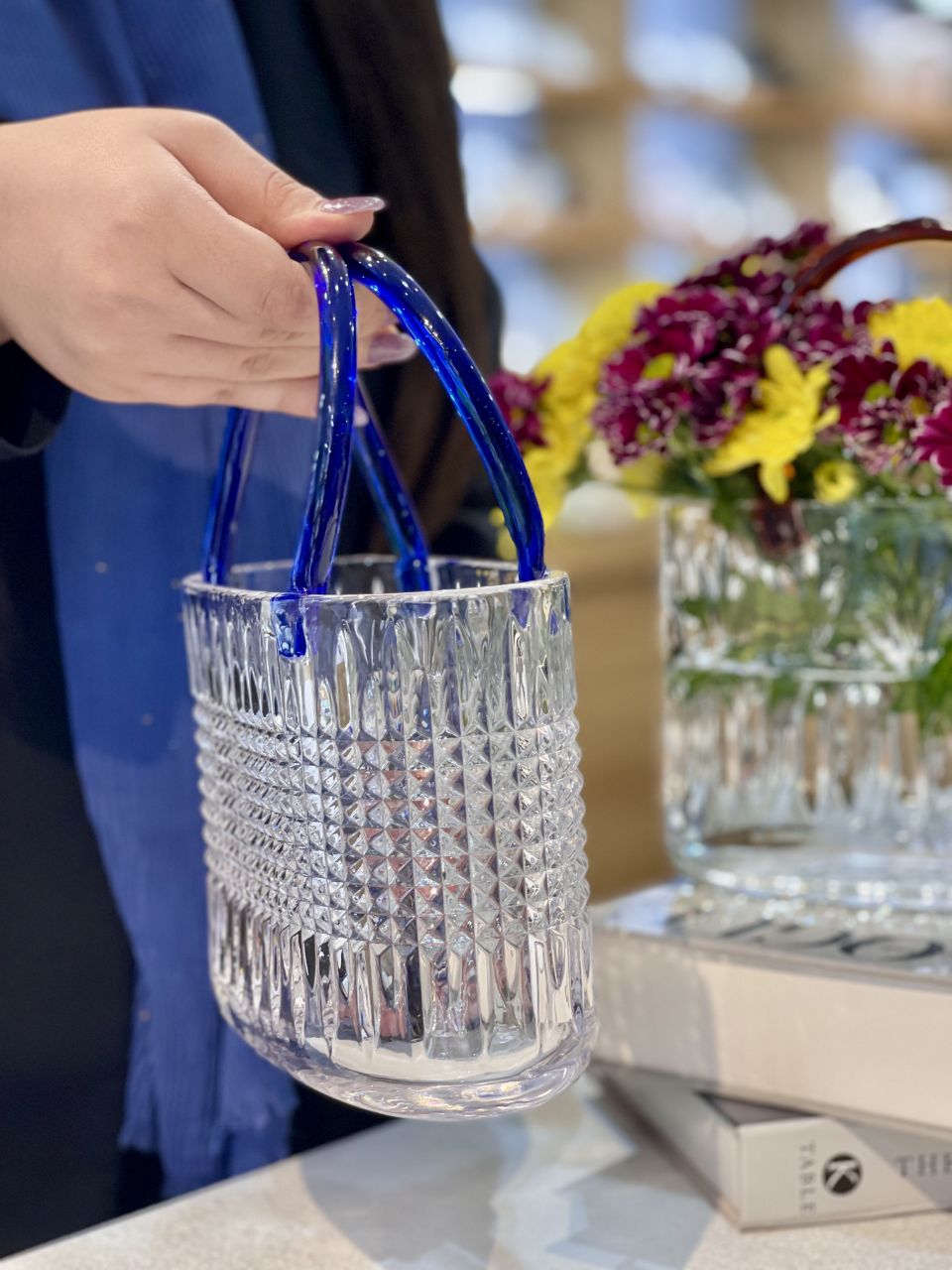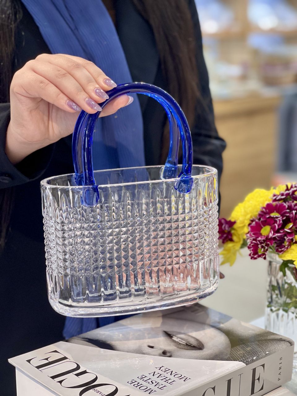 گلدان سبد کریستالی دسته رنگی