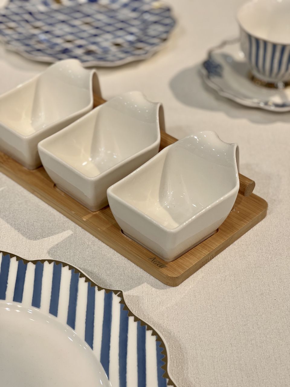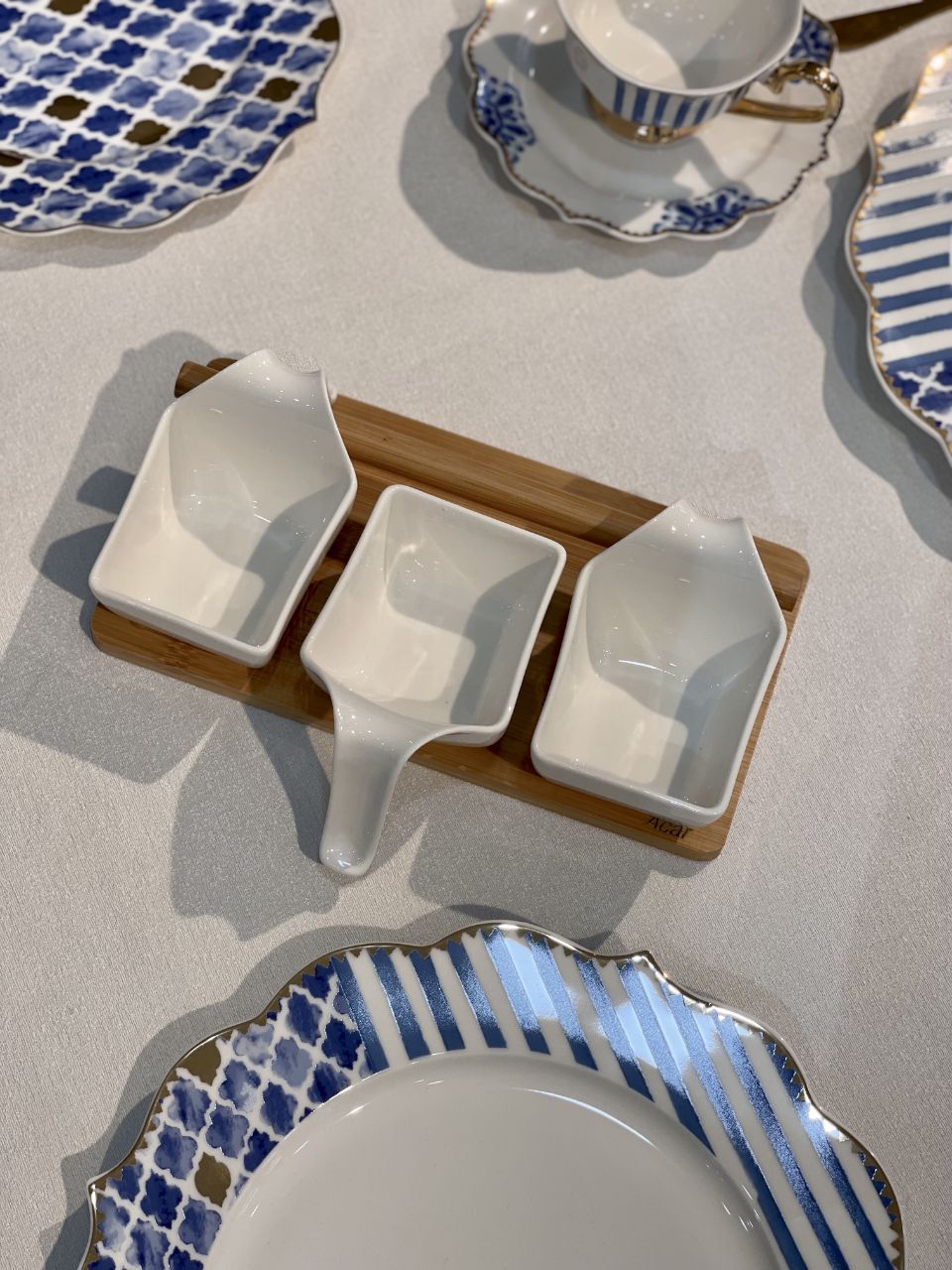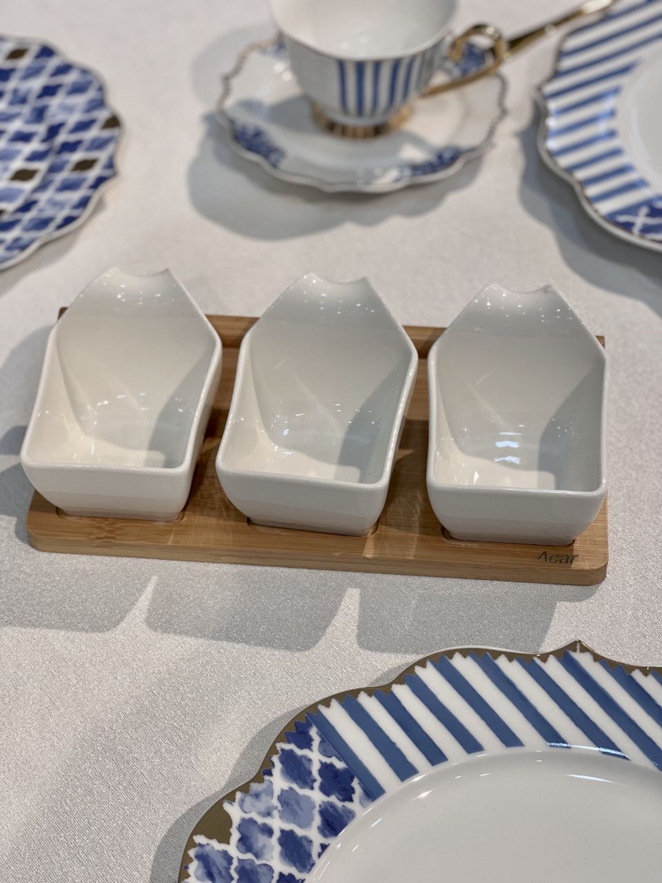 اردور خوری سه خانه La pure محصول acar ترکیه🇹🇷🇹🇷🇹🇷 استند از جنس بامبو پیاله ها از جنس چینی پورسلن قابل استفاده در ماشین ظرفشویی و ماکروفر طول:23.5 سانتیمتر عرض:12.5 سانتیمتر